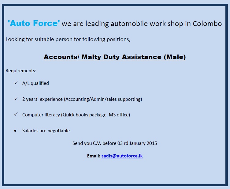 We are looking for an Accounts / Malty Duty Assistance (Male) with 2 years' experience in Accounting, Admin and sales supporting. Should be A/L qualified. Computer literacy in Quick books package and MS Office is highly desirable.