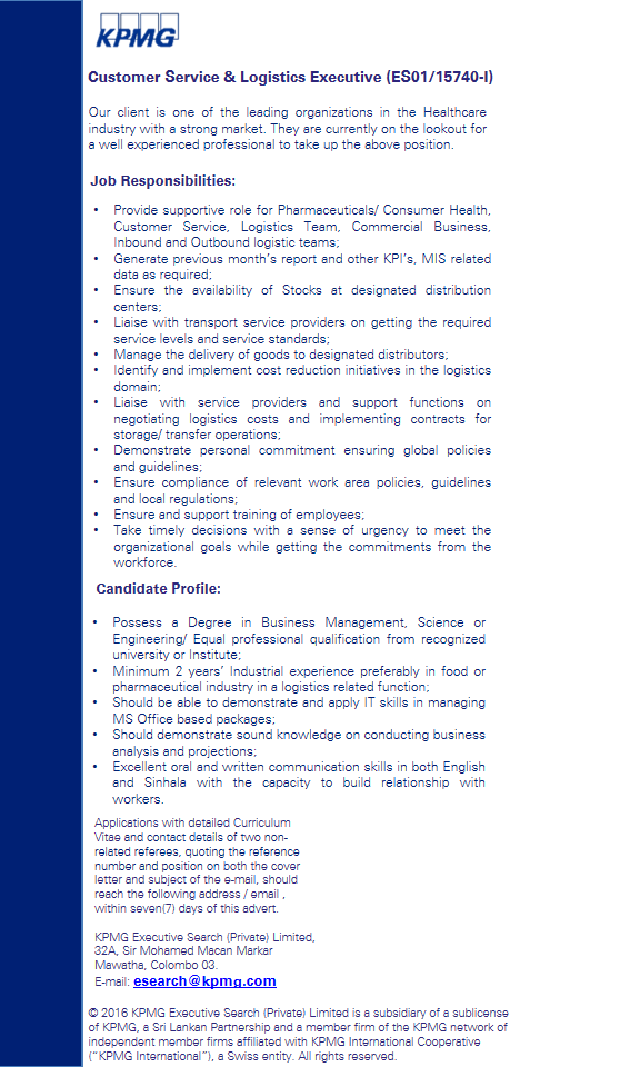 Customer Service & Logistics Executive - Our client is one of the leading organizations in the Healthcare